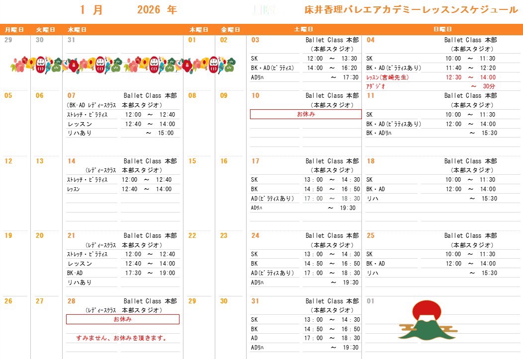 尚、各クラスのレッスン時間は、毎月お配りしますタイムスケジュール表をご参照ください。